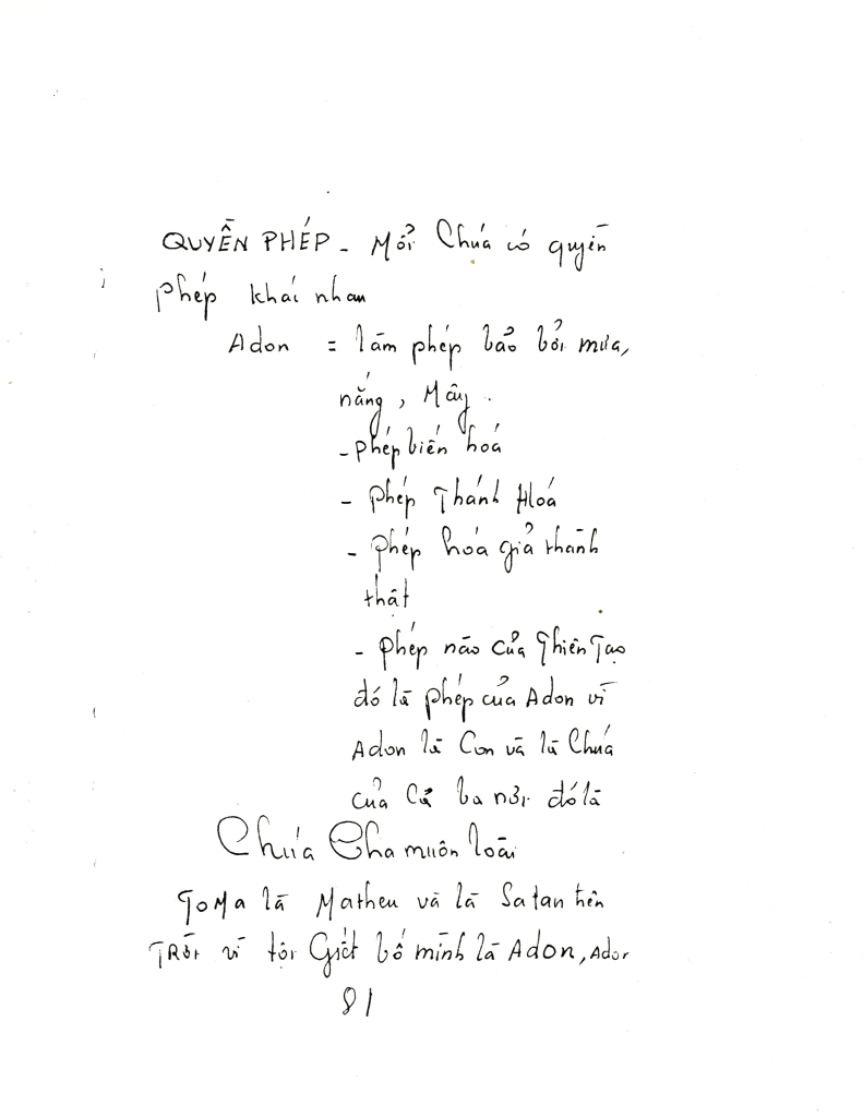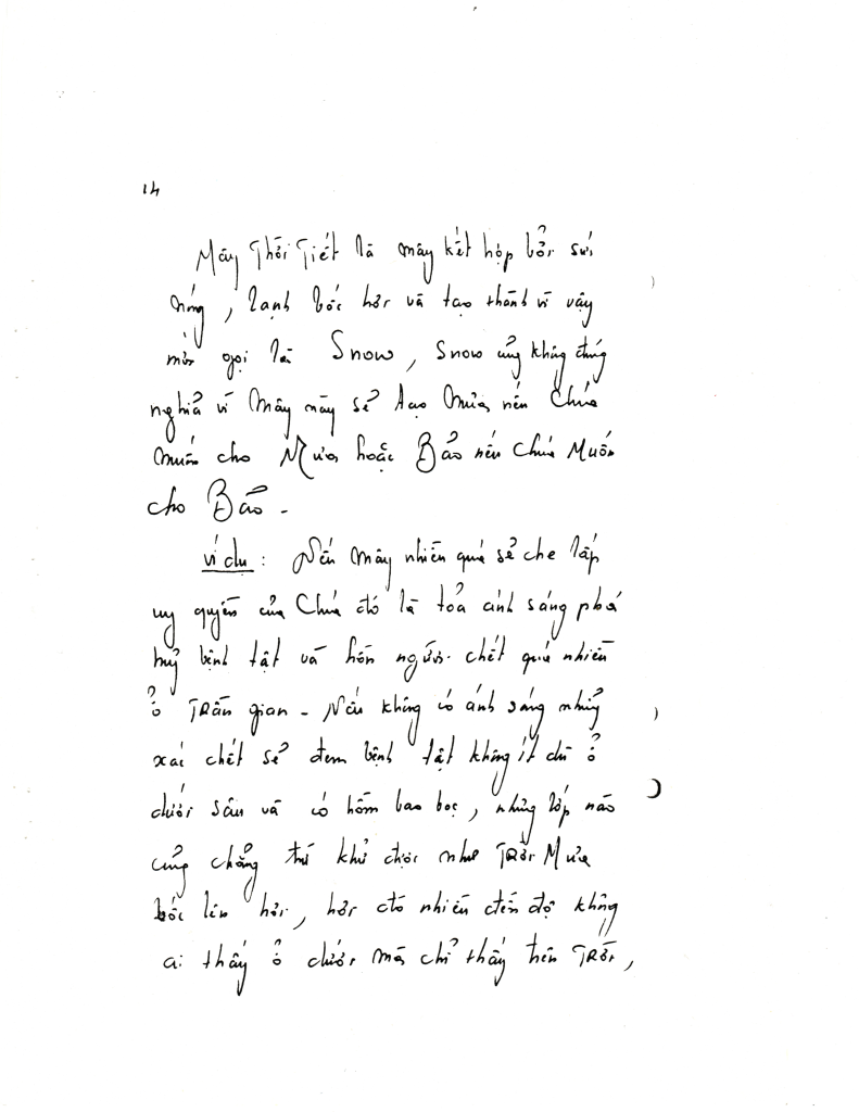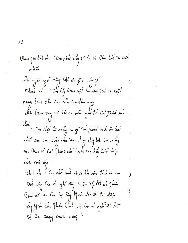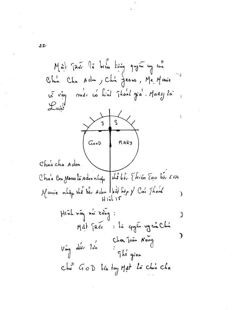 Phép qua hình hay thể hiện qua con người , vật thể dưới dạng phép lạ cho tôi tin sự hiện diện của Chúa , lời Chúa thì phải có thời gian tiếp diễn vào sự việc liên tục vì thế CHÚA để tôi như vật thể không hồn mà bỏ đi mọi sự cá nhân và bổn phận khi viết , luôn sợ ngưng mất chúa nên thời gian ít là gần một năm tôi là người điên vì ai ngăn cản hay xúc phạm về đức tin vào chúa thì tôi phản đối , nói về CHÚA thì càng không ai tin . Mẹ tôi nói lo cho chồng con là đủ , chồng tôi thì nói chúa nào chỉ có mấy người TU mới được có chúa – chồng tôi có đạo khi cưới tôi . CHÚA cho tôi nhận định là Thánh là CHÚA sau khỏang chừng 6 tháng nhận định và vào chữ viết . khởi đầu có sự tuyên xưng là chúa , Thánh hay linh hồn một người thân qua đời . Người thân yêu bình thường cho cảm xúc yêu thương vào những cử chỉ khi còn sống , rất sống động tuân tràn nước mắt tuy nhiên thời gian thì không . sau một Năm năng khí như đã xa chỉ có khi đọc kinh cầu nguyện trong âm thầm và là giờ riêng mới có cảm xúc thật , là có còn trong linh hồn ?