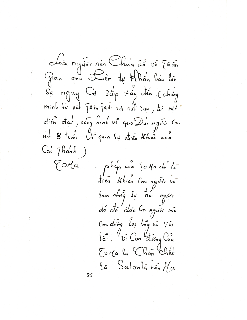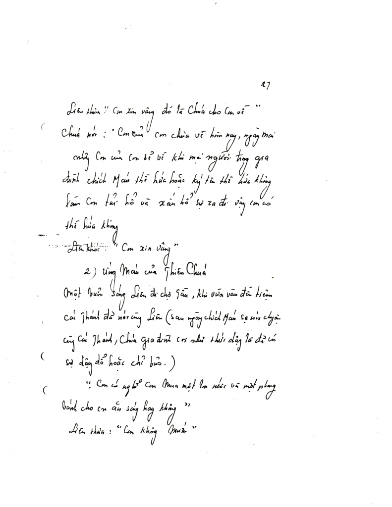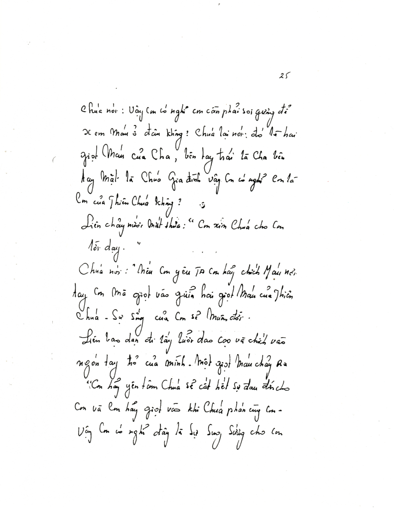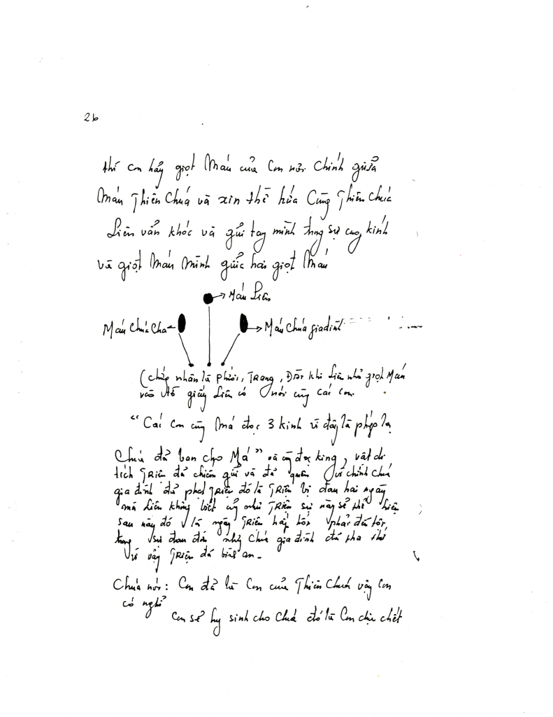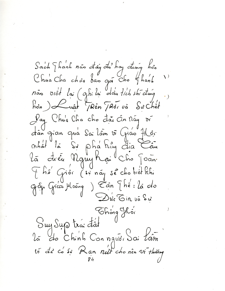 Sau hai Tập viết I / 2007 – 2009 viết hơn hoặc ít hơn 600 trang có hình trao cho giáo hội . song song qua báo đạo ,đời truyền lới về phúc Âm , khoa học ghi nhận vào thế kỷ , về hiện tượng trái đất ; lời thứ hai mạc khải 1984 . chặng đường dài làm việc trong âm thầm mà lluôn cả trong bổn phận gia đình để có sự bình yên , mà cũng vì thế tôi trở về là tôi đã tràn đầy trong Chúa từ 1986 qua phép , trong phép lạ như lon nước táo hóa MÁU hỏi tôi về đức tin tôi có tin là chúa . và phong bánh mua cùng lúc chúa nói cho các con của tôi . Phong bánh đã mở ra tối cùng ngày sau khi đọc kinh xong . Bánh đã bể cả phong bánh mà chỉ còn lại một bánh với chữ JS . Tôi đã xúc động mà ôm lòng ngực cảm tạ chúa ̣̣̣- ĐỀ mục này như tôi , gia đình tôi là xưng tội , hãm mình ….chỉ nhắc lại phần ngắn gọn khi cần nói , suỗt thời gian dài quã dài cõ nói đến nhưng không là tất cả w.w.w. theresaliendinh.com là những phần bài khởi đầu 1984 CHÚA đã dẫn tôi từ bóng tỗi vào ánh sáng quyền năng của Thiên Chúa , có trong phúc Âm nhưng không phụ thuộc vào phúc Âm mà có . Chúa nói là tái diễn nên sự làm việc của tôi luôn nghĩ làm việc vẫn là Giáo Hội nên không nói ra nhiều để phân giải những phãn xét .